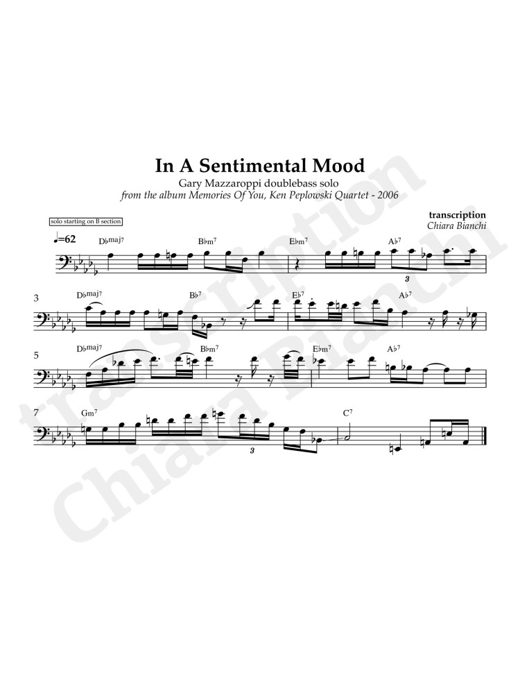 Per un caso del tutto fortuito, quindi, ho sentito le prime, inconfondibili note di In A Sentimental Mood, capolavoro di Duke Ellington che amo particolarmente, eseguito da una formazione che non conoscevo: il Ken Peplowski Quartet. A un certo punto, durante il solo di piano, in maniera del tutto inaspettata sulla B sento fiorire (è il verbo più adeguato) un solo di contrabbasso.